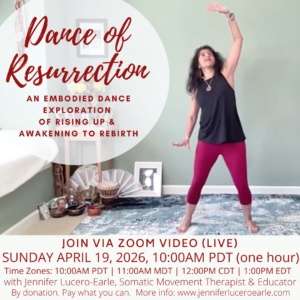 Jennifer Lucero-Earle is a trauma-informed Registered Somatic Movement Therapist and Educator who has been teaching dance as healing for over 20 years. She weaves together somatic awareness, elemental wisdom, and creative movement to support resilience, embodiment, and transformation—and is very much looking forward to dancing with you.