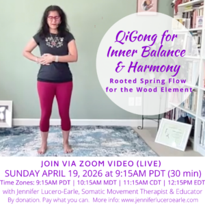 Jennifer Lucero-Earle is a trauma-informed Registered Somatic Movement Therapist and Educator (RSMT/E) who has been teaching embodied movement for over 20 years. Her lineage of QiGong teachers and mentors includes Dr. Robert Woodbine, Dr. Jwing-Ming Yang, Lee Holden, Daisy Lee, Marisa Cranfill, and Mimi Kuo-Deemer.